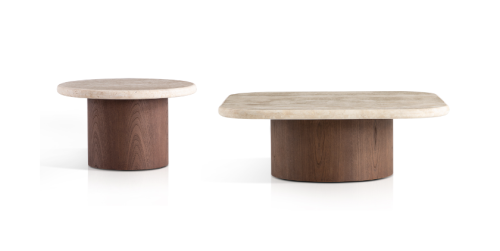 Las mesas de centro Monaco y Fossola, evocan una mezcla de elegancia orgánica y diseño moderno o minimalista. Presentan una tapa ovalada o rectangular de travertino blanco, un tipo de piedra natural con vetas únicas, y bordes elegantemente redondeados. La base es un pedestal cilíndrico robusto de madera de olmo con tono nogal.