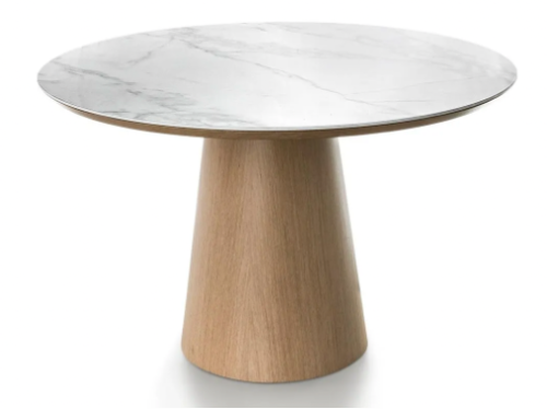 La mesa Roble es una pieza redonda que presenta un volumen semicónico único de madera y sobre de mármol de cerámica. La combinación de materiales de alta calidad y un diseño geométrico único convierte a esta mesa en una pieza de gran impacto visual, perfecta para agregar estilo y sofisticación a cualquier comedor.